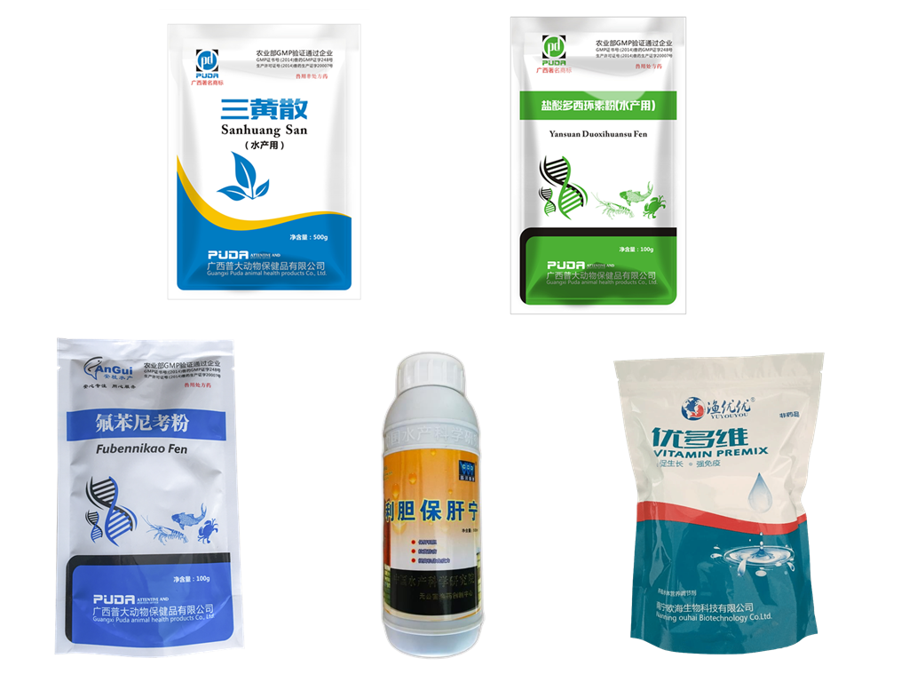 內(nèi)服:三黃散 100g+普大多西環(huán)素 100g+普大氟苯尼考 100g+利膽保肝寧 250ml+ 優(yōu)多維 100g。拌20公斤料,每天2餐,連用5天。